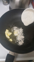 So, let's continue with last night's coffee yummy. First, make your roux. Butter + Flour. Melt butter, add flour, stir a plenty. Brown it. Add your coffee-fat left overs. Stir and cook. If thin, add flour/corn starch until it's as thick as you want.